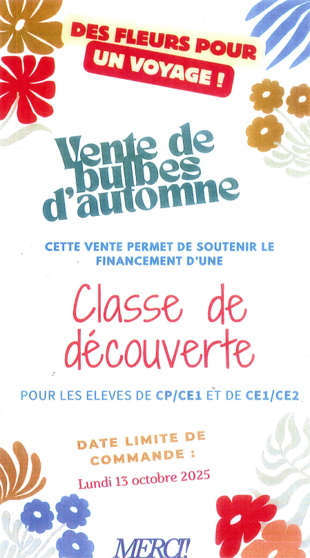 Vente de bulbes d’automne « Des fleurs pour un voyage.. » Un projet de classe de découverte est organisé pour les élèves des classes de CP/CE1 et de CE1/CE2 en fin